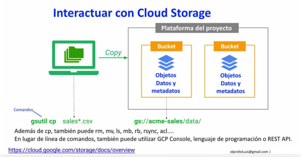 Se pueden copiar archivos con «gsutil-cp». Aparte de eso, se pueden quitar con «rm» «mv» es para mover, que es copiarlo y luego borrarlo localmente. Se puede usar «ls» para mostrar una lista de elementos en la nube.